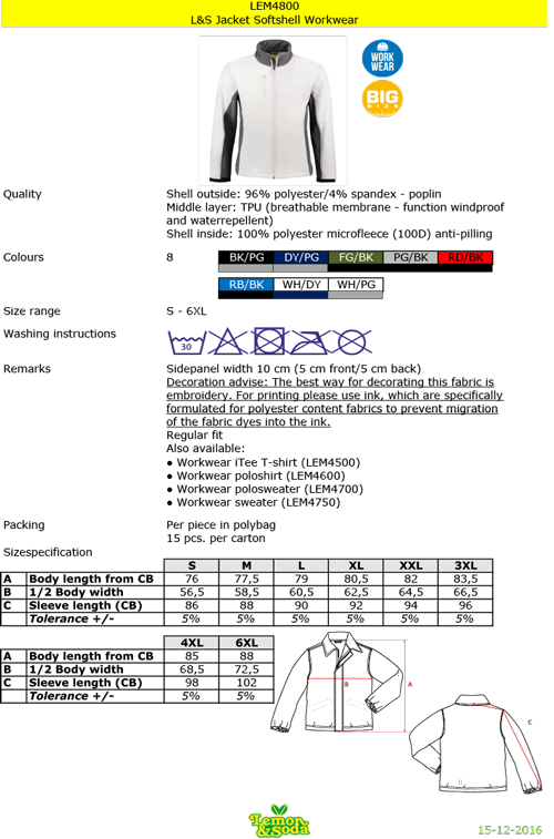 Lemon & Soda workwear softshell jacket. Comfortabele jas, gemaakt van een zware kwaliteit softshell. De jas is winddicht, waterafstotend en ademend. Daarnaast heeft het zijzakken met rits, reflecterende piping en een YKK-ritssluiting.